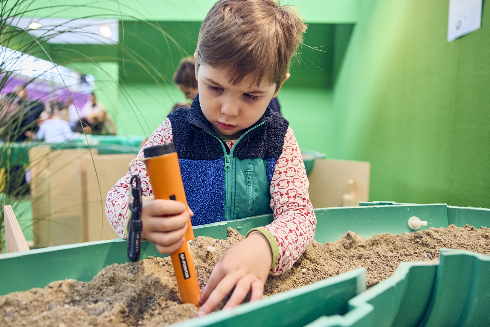 Numerous little treasures are waiting to be discovered in the large sandpit. Young visitors can use sieves and shovels to sift through the sand mountains layer by layer to find hidden surprises.