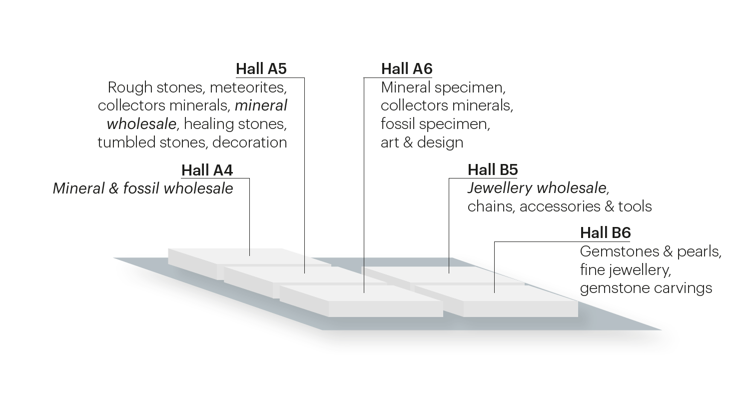 Booth options at the show range from raw space to table booths and further up to completely equipped full-service booths. Among the most popular solutions for mineral and fossil wholesale exhibitors are wall table booth in hall A4 as well as raw space in the wholesale area of hall A5. Starting from 24 square meters, there is a discount on the space price - giving wholesale exhibitors more options for their show participation.